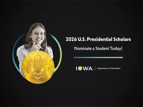 It’s time to honor Iowa’s outstanding high school seniors! The Iowa Department of Education is now accepting nominations for the 2026 U.S. Presidential Scholars program, one of the highest honors a student can achieve. Nominations will be accepted through Jan. 27.
